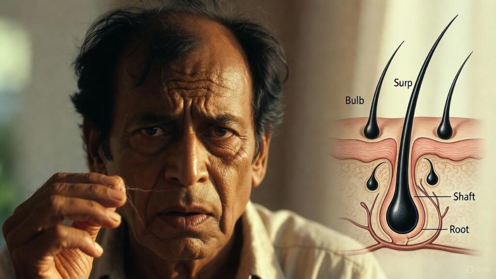 Hair Loss यानी सिर के बालों का तेजी से टूटना, झड़ना या पतला होना। इंसान के सिर पर औसतन 1 लाख बाल होते हैं, जिनमें से हर दिन 50–100 बाल गिरना सामान्य है। लेकिन जब यह संख्या 200–300 के पार जाने लगे, तो यह Hair Fall नहीं बल्कि Hair Loss कहलाता है।