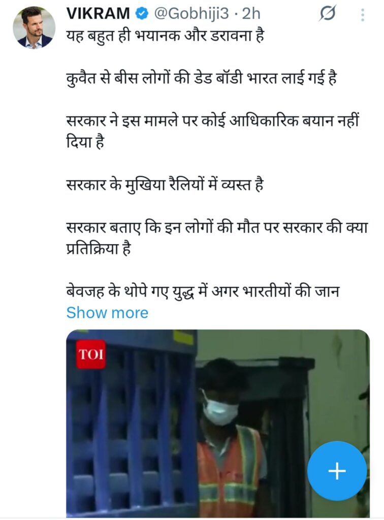 यह बहुत ही भयानक और डरावना है कुवैत से बीस लोगों की डेड बॉडी भारत लाई गई है सरकार ने इस मामले पर कोई आधिकारिक बयान नहीं दिया है सरकार के मुखिया रैलियों में व्यस्त है सरकार बताए कि इन लोगों की मौत पर सरकार की क्या प्रतिक्रिया है बेवजह के थोपे गए युद्ध में अगर भारतीयों की जान गई तो क्या इसके।लिए अमेरिका को दोषी नहीं ठहराया जाएगा क्या सरकार इन मौतों का कड़ा विरोध नहीं कर सकती है? आखिर इतना डर क्यों?💔 ये सिर्फ 20 लोग नहीं थे ये 20 सपने थे 20 परिवारों की उम्मीद थे और अब सिर्फ सवाल बनकर रह गए हैं